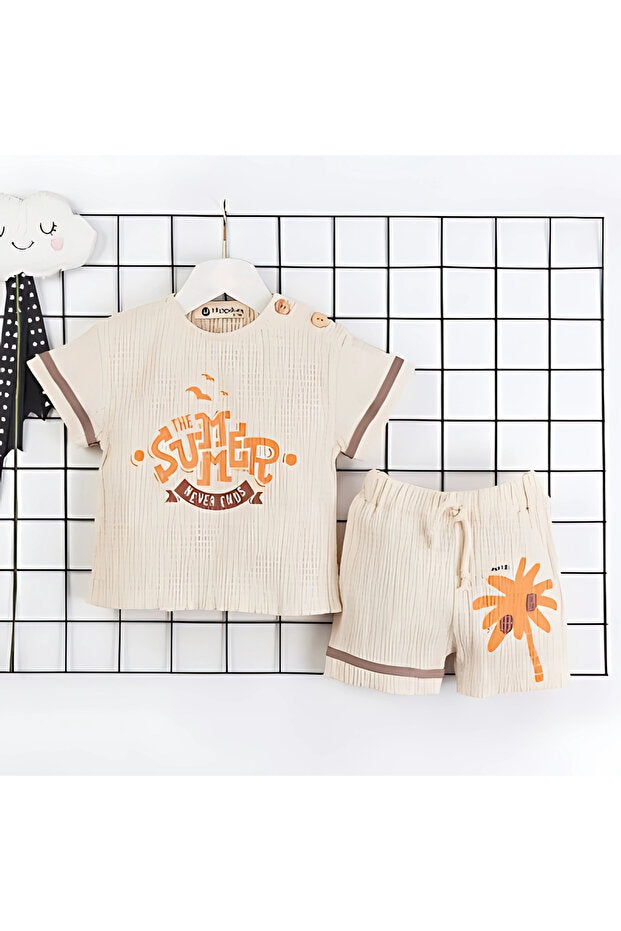 - Yazlık kısa kollu bebek şortlu takım, üst kısmında "The Summer Never Ends" yazılı eğlenceli baskısı ile dikkat çekerken, alt kısmındaki palmiye ağacı detayıyla yaz havasını yansıtır.