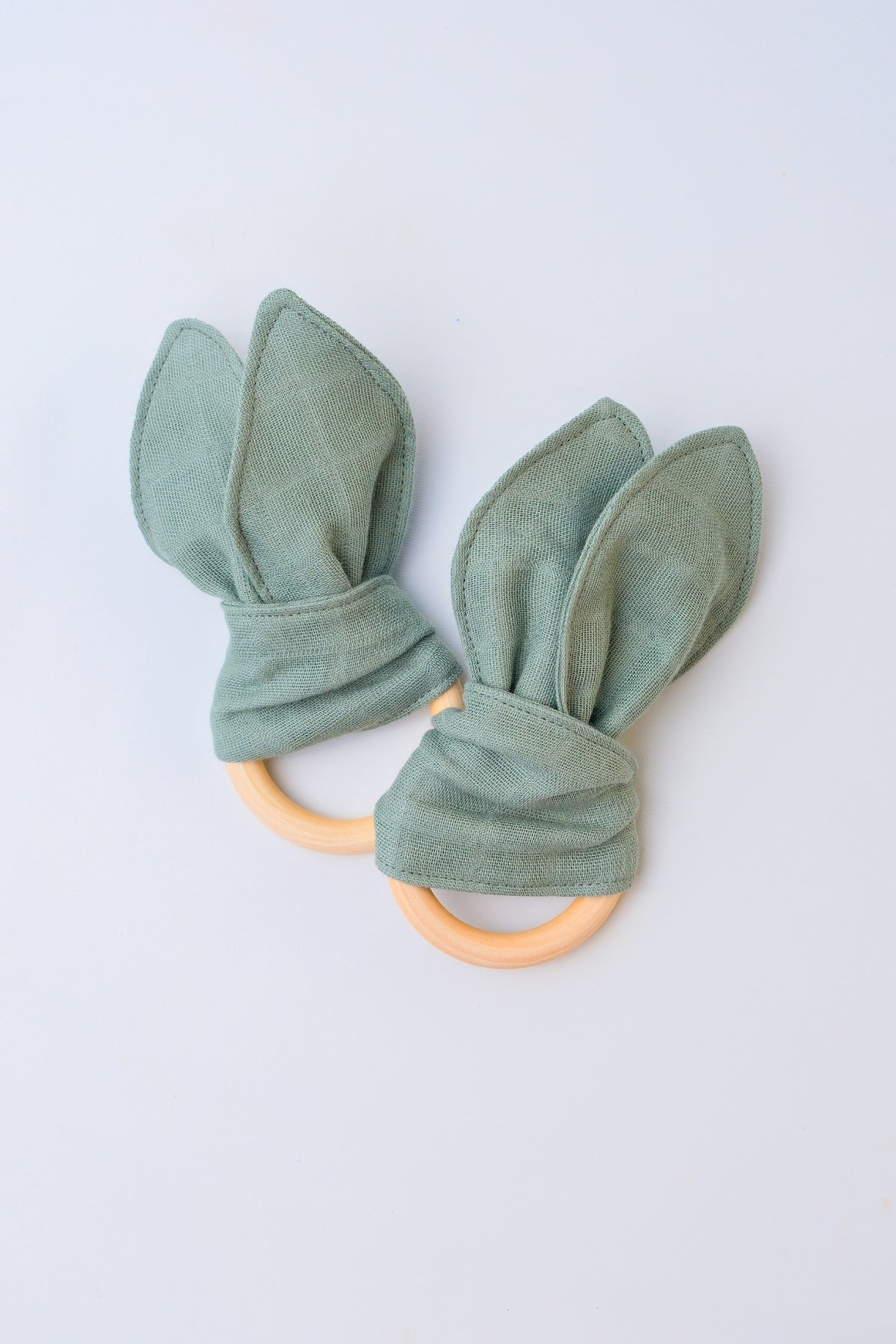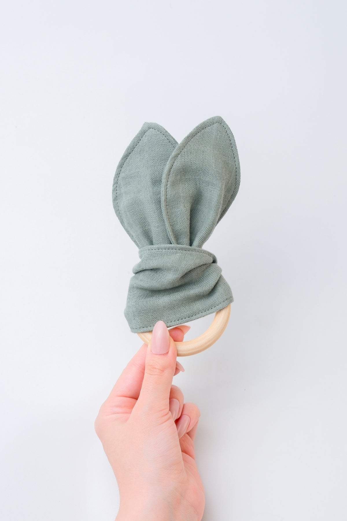 Ergonomik ahşap halka,minik eller için kavraması kolaydır; yumuşak müslin kumaş ise diş çıkarma döneminde rahatlatıcı bir etki sunar.