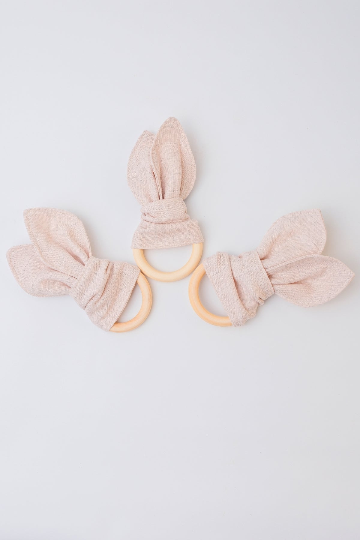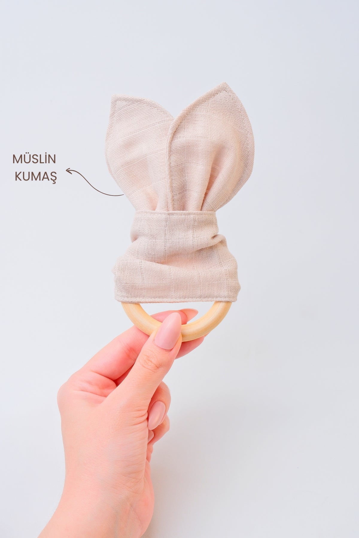 • Ergonomik ahşap halka,minik eller için kavraması kolaydır; yumuşak müslin kumaş ise diş çıkarma döneminde rahatlatıcı bir etki sunar.